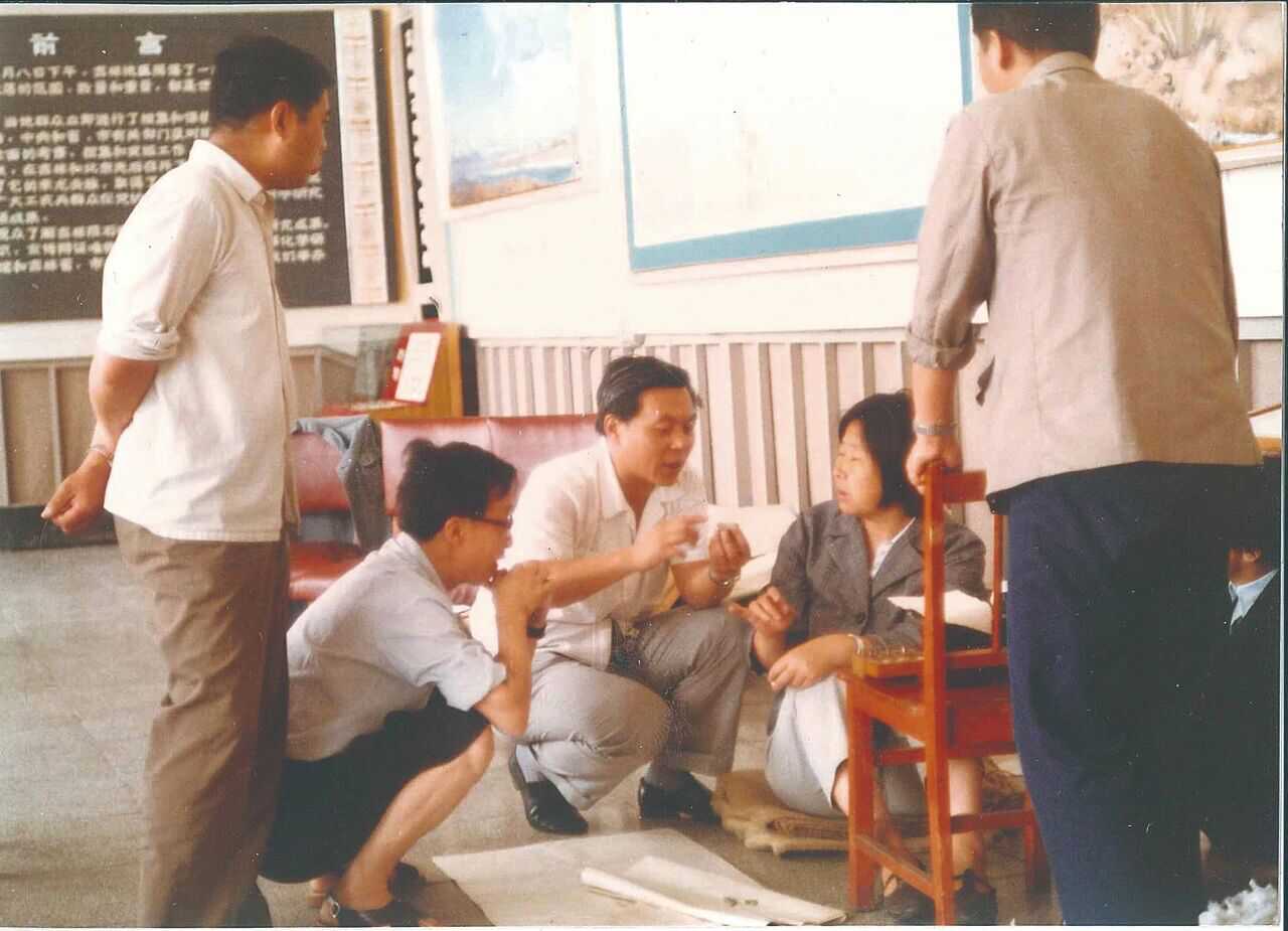 1980年,欧阳自远(中)和中德陨石联合研究小组成员讨论吉林陨石岩芯取样的相关问题。