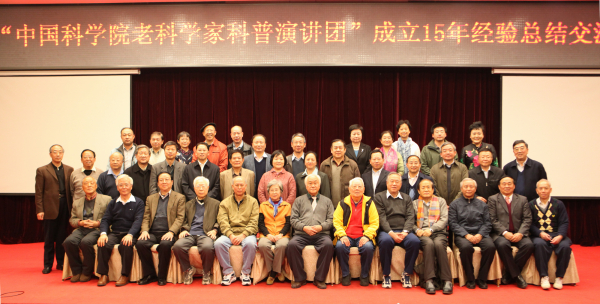 科普演讲团成立十五周年纪念会上,时任中科院党组副书记方新和时任中国科协党组副书记程东红以及北京市科协等领导与全体团员合影